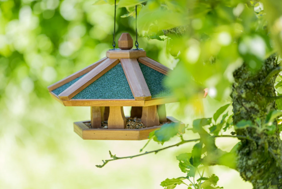 Futterhaus in runder Form zum Aufhängen mit großer Landefläche für die freilebenden Vögel.