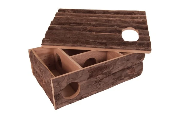 Das Spiel- und Schlafhaus hat eine Rampe, welche in eine der 4 Kammern führt. Von dort aus kann der Hamster durch das Labyrinth spazieren. 2 sind abgedunkelt und dienen als Schlafplatz. Es ist aus Naturholz gefertigt und kann problemlos angenagt werden. Das Dach ist abnehmbar und erleichtert so die Reinigung der Kammern.