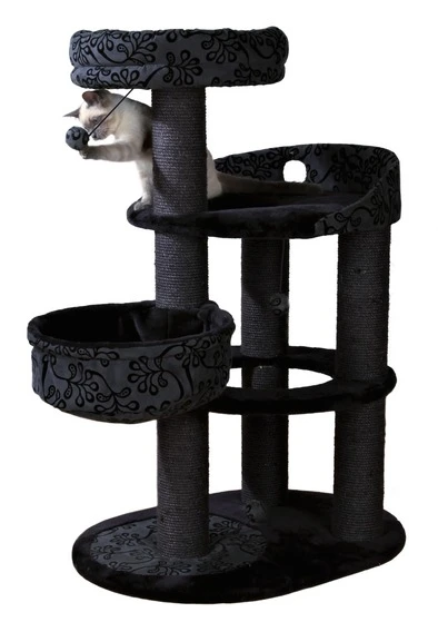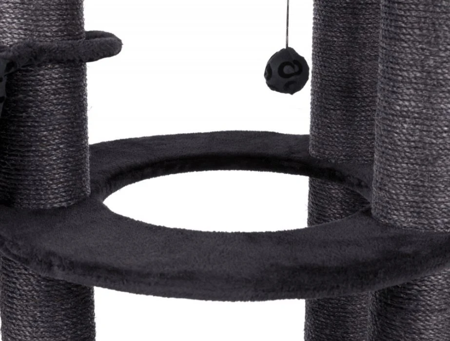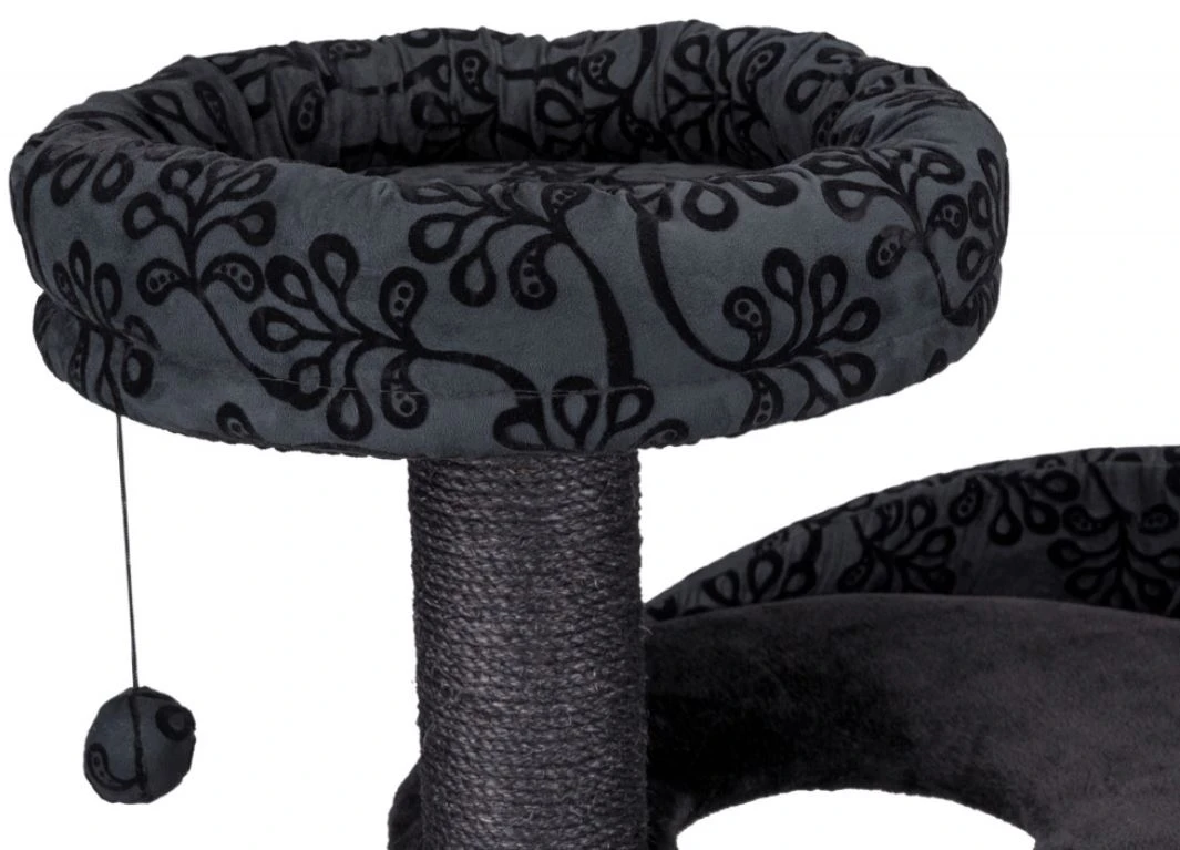 Wunderschöner Kratzbaum mit viel Zubehör und Ausstattung in modernem Schwarz. Mit Kuschelsack, Spielseil, 2 Bettchen und einem tollen Ring zum Drauf- und Druchklettern.